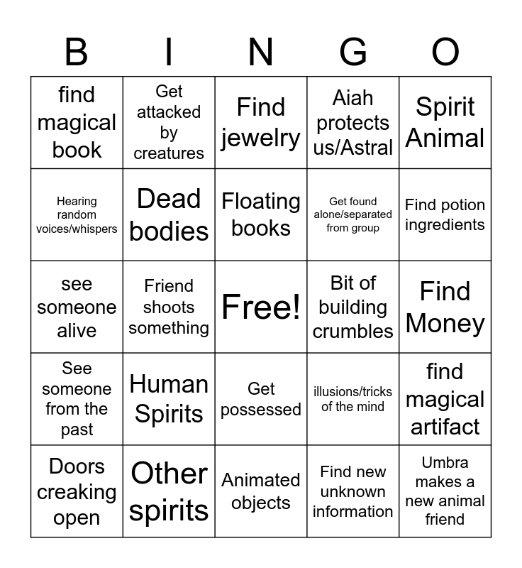 This bingo card has a free space and 24 words: Human Spirits, Other spirits, Floating books, Doors creaking open, Spirit Animal, find magical book, Hearing random voices/whispers, Get attacked by creatures, Bit of building crumbles, Get possessed, Get found alone/separated from group, see someone alive, illusions/tricks of the mind, find magical artifact, Dead bodies, Find new unknown information, Find Money, Find jewelry, Find potion ingredients, Friend shoots something, Umbra makes a new animal friend, See someone from the past, Aiah protects us/Astral and Animated objects.