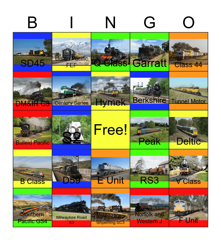 This bingo card has 24 images, a free space and 24 words: D59, Milwaukee Road S3, Hymek, Southern Pacific GS4, Class 44, SD45, DM&IR C3, Union Pacific FEF, Peak, E Unit, Berkshire, Bulleid Pacific, RS3, V Class, Century Series, Norfolk and Western J, Deltic, Q Class, Tunnel Motor, S2, F Unit, B Class, Garratt and Lake Superior and Ishpeming SC3.