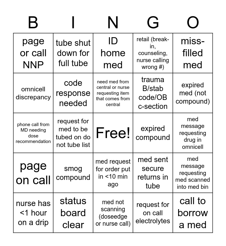 This bingo card has a free space and 39 words: compatibility question, TPN issue, alteplase, code response needed, nurse has <1 hour on a drip, med request for order put in <10 min ago, need med from central or nurse requesting item that comes from central, fast mover out of stock, miss-filled med, page on call, request for med to be tubed on do not tube list, retail (break-in, counseling, nurse calling wrong #), call to borrow a med, med message requesting drug in omnicell, expired compound, smog compound, premix station with >5 to prep, page or call NNP, rec from a consult service, med sent secure returns in tube, omnicell discrepancy, med not scanning (doseedge or nurse call), trauma B/stab code/OB c-section, expired med (not compound), new DKA needs bags, doseedge bypass, brand new TPN, new LOS/EOS orders, call from outside pharm to borrow med, tube shut down for full tube, request for vfc vaccine, recon antibiotic, ID home med, status board clear, request for on call electrolytes, omnicell issue, med message requesting med scanned into med bin, phone call from MD needing dose recommendation and critical dose warning override.