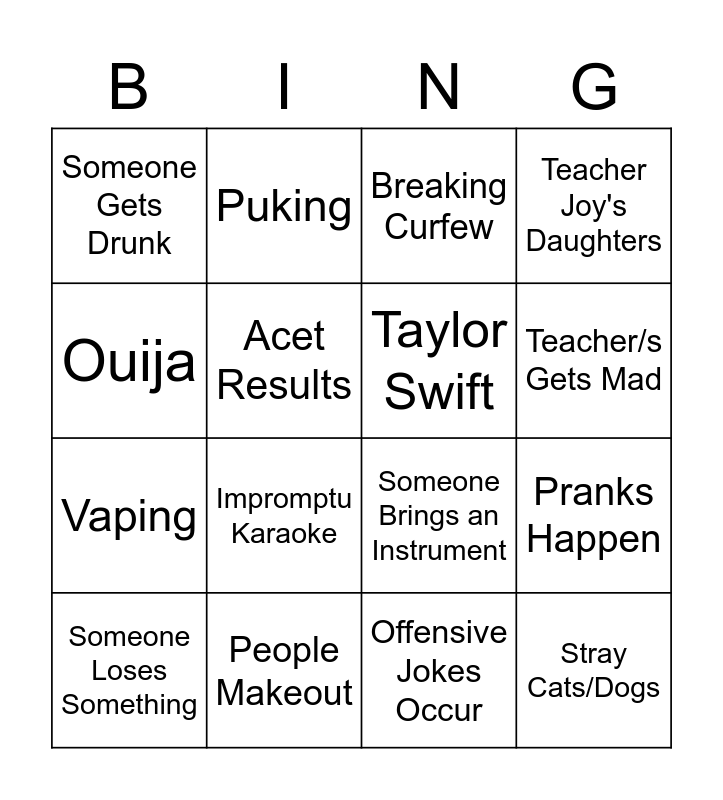 This bingo card has 16 words: People Makeout, Pranks Happen, Breaking Curfew, Someone Gets Drunk, Vaping, Puking, Someone Brings an Instrument, Offensive Jokes Occur, Ouija, Acet Results, Someone Loses Something, Teacher Joy's Daughters, Impromptu Karaoke, Teacher/s Gets Mad, Taylor Swift and Stray Cats/Dogs.