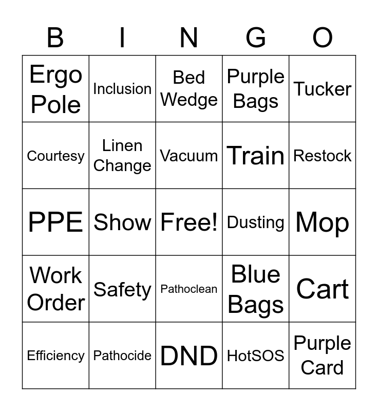 This bingo card has a free space and 24 words: Safety, Pathocide, Vacuum, Efficiency, Tucker, Ergo Pole, Courtesy, Inclusion, Dusting, Pathoclean, Train, PPE, Blue Bags, Cart, Linen Change, HotSOS, Mop, Bed Wedge, Restock, Show, Purple Card, Work Order, Purple Bags and DND.