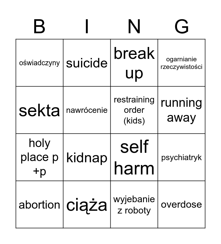 This bingo card has 16 words: ciąża, psychiatryk, break up, oświadczyny, holy place p +p, suicide, self harm, wyjebanie z roboty, sekta, nawrócenie, abortion, ogarnianie rzeczywistości, kidnap, running away, restraining order (kids) and overdose.