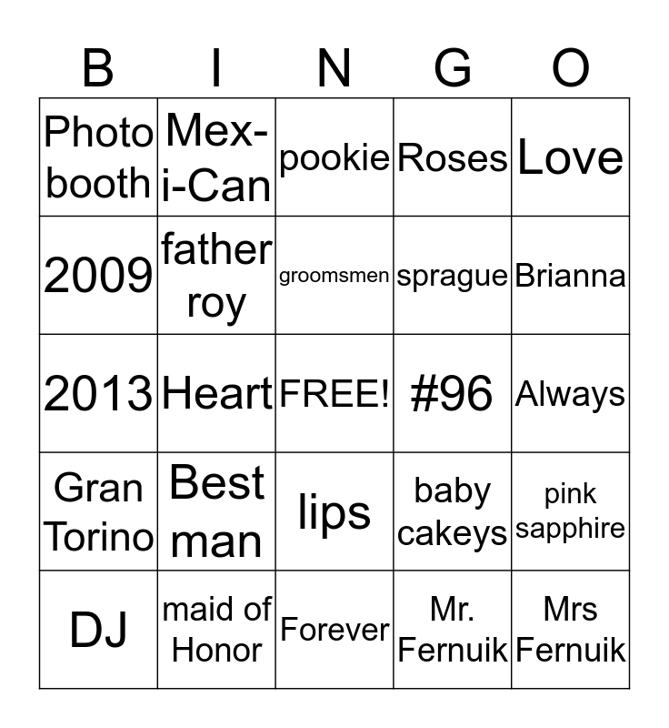 This bingo card has a free space and 24 words: Best man, maid of Honor, groomsmen, DJ, Love, Photo booth, 2009, Mex-i-Can, #96, lips, sprague, 2013, baby cakeys, pink sapphire, father roy, Mr. Fernuik, Always, pookie, Brianna, Heart, Mrs Fernuik, Gran Torino, Roses and Forever.