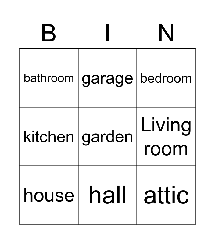 This bingo card has a free space and 8 words: Living room, bedroom, garage, house, bathroom, attic, kitchen and hall.