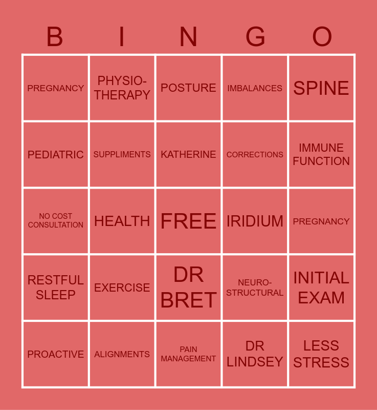 This bingo card has a free space and 26 words: DR BRET, DR LINDSEY, KATHERINE, ALIGNMENTS, SPINE, PREGNANCY, PEDIATRIC, PHYSIO- THERAPY, PREGNANCY, NEURO- STRUCTURAL, CORRECTIONS, NO COST CONSULTATION, INITIAL EXAM, PROACTIVE, HEALTH, NUTRITION, IMBALANCES, RESTFUL SLEEP, POSTURE, LESS STRESS, IMMUNE FUNCTION, PAIN MANAGEMENT, IRIDIUM, EXERCISE, SUPPLIMENTS and HYDRATES.