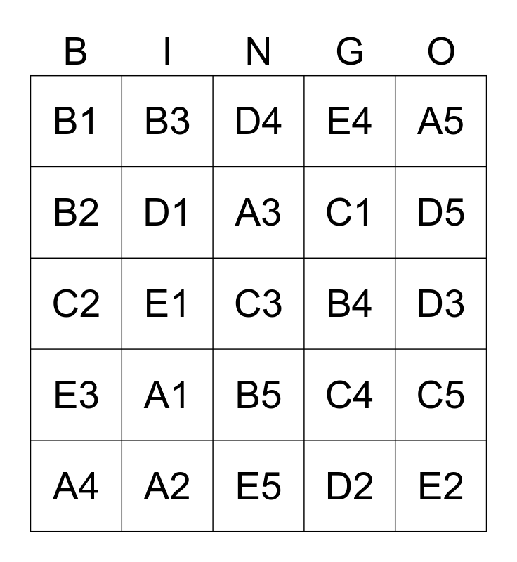 This bingo card has a free space and 24 words: A1, A2, A3, A4, A5, B1, B2, B3, B4, B5, C1, C2, C4, C5, D1, D2, D3, D4, D5, E1, E2, E3, E4 and E5.