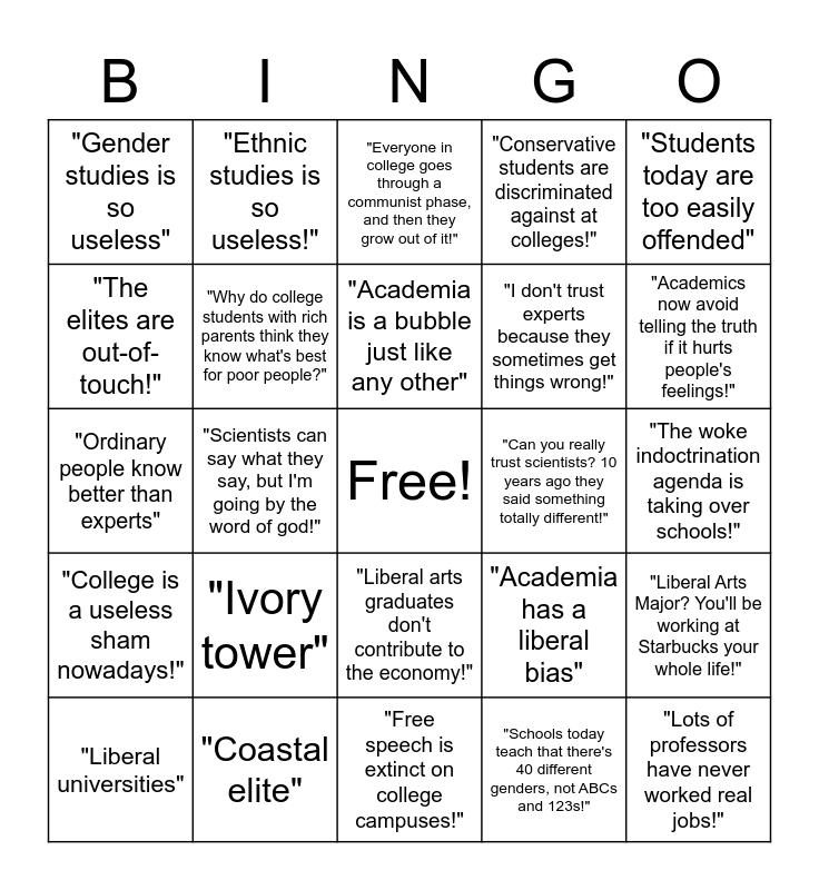 This bingo card has a free space and 24 words: "Ivory tower", "Coastal elite", "Academia is a bubble just like any other", "Liberal universities", "Students today are too easily offended", "Gender studies is so useless", "The elites are out-of-touch!", "Ethnic studies is so useless!", "Can you really trust scientists? 10 years ago they said something totally different!", "Liberal arts graduates don't contribute to the economy!", "I don't trust experts because they sometimes get things wrong!", "Ordinary people know better than experts", "Academia has a liberal bias", "Liberal Arts Major? You'll be working at Starbucks your whole life!", "Why do college students with rich parents think they know what's best for poor people?", "Schools today teach that there's 40 different genders, not ABCs and 123s!", "The woke indoctrination agenda is taking over schools!", "Everyone in college goes through a communist phase, and then they grow out of it!", "Academics now avoid telling the truth if it hurts people's feelings!", "Scientists can say what they say, but I'm going by the word of god!", "Lots of professors have never worked real jobs!", "College is a useless sham nowadays!", "Conservative students are discriminated against at colleges!" and "Free speech is extinct on college campuses!".