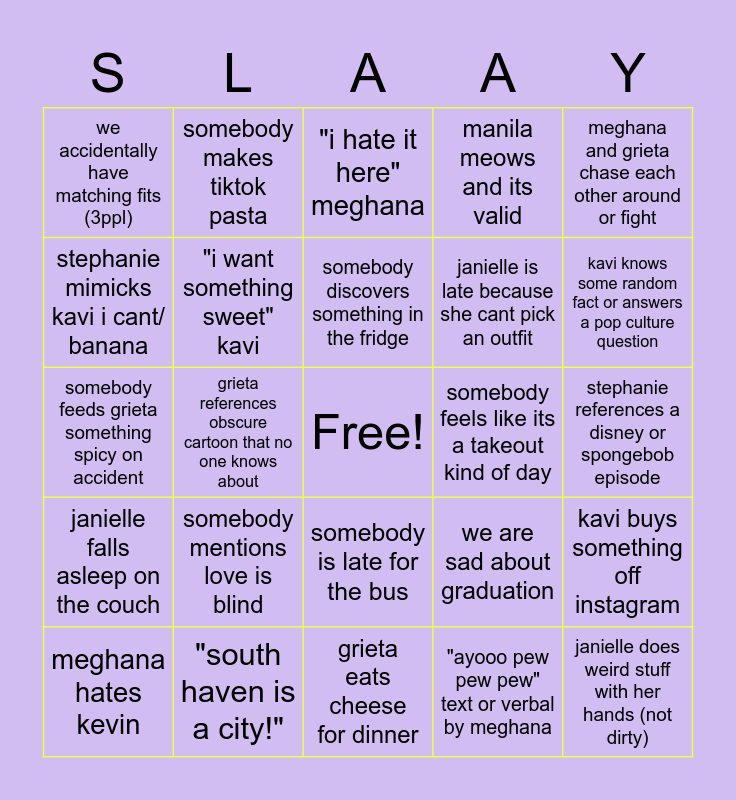 This bingo card has a free space and 24 words: somebody mentions love is blind, "south haven is a city!", somebody discovers something in the fridge, meghana hates kevin, meghana and grieta chase each other around or fight, we accidentally have matching fits (3ppl), stephanie mimicks kavi i cant/ banana, somebody makes tiktok pasta, somebody feels like its a takeout kind of day, somebody is late for the bus, janielle is late because she cant pick an outfit, somebody feeds grieta something spicy on accident, we are sad about graduation, kavi buys something off instagram, "i want something sweet" kavi, "ayooo pew pew pew" text or verbal by meghana, stephanie references a disney or spongebob episode, "i hate it here" meghana, kavi knows some random fact or answers a pop culture question, grieta references obscure cartoon that no one knows about, janielle does weird stuff with her hands (not dirty), janielle falls asleep on the couch, manila meows and its valid and grieta eats cheese for dinner.