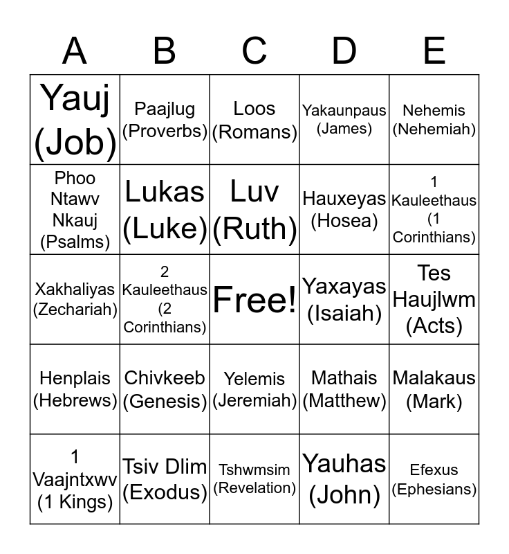 This bingo card has a free space and 24 words: Chivkeeb (Genesis), Tsiv Dlim (Exodus), Luv (Ruth), 1 Vaajntxwv (1 Kings), Nehemis (Nehemiah), Yauj (Job), Phoo Ntawv Nkauj (Psalms), Paajlug (Proverbs), Yaxayas (Isaiah), Yelemis (Jeremiah), Hauxeyas (Hosea), Xakhaliyas (Zechariah), Mathais (Matthew), Malakaus (Mark), Lukas (Luke), Yauhas (John), Tes Haujlwm (Acts), Loos (Romans), 1 Kauleethaus (1 Corinthians), 2 Kauleethaus (2 Corinthians), Efexus (Ephesians), Henplais (Hebrews), Yakaunpaus (James) and Tshwmsim (Revelation).