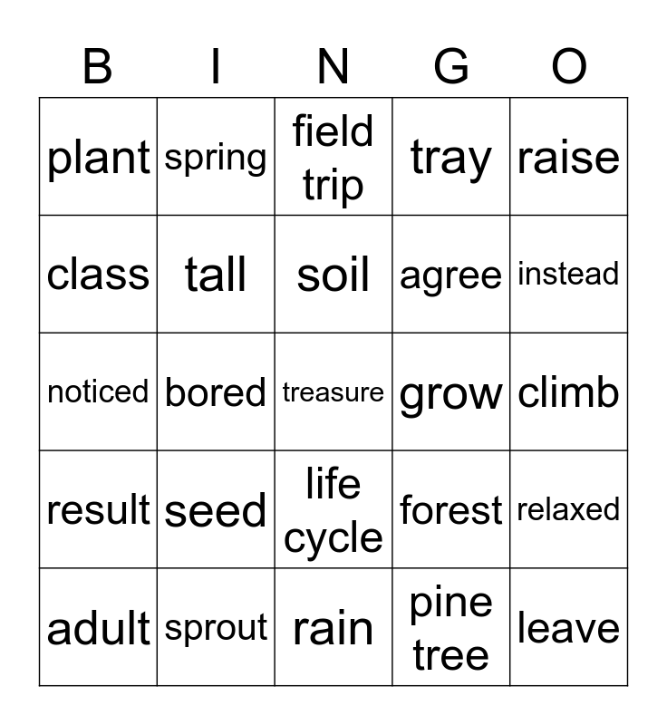 This bingo card has a free space and 24 words: seed, sprout, soil, adult, raise, plant, class, spring, grow, life cycle, agree, noticed, forest, relaxed, tall, pine tree, climb, field trip, instead, bored, leave, result, tray and rain.