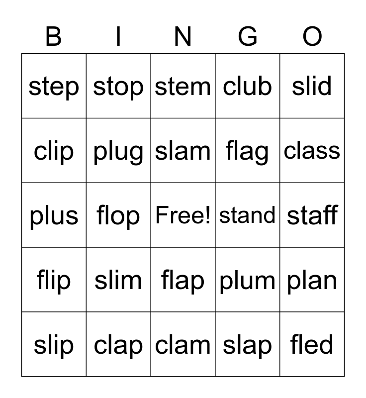 This bingo card has a free space and 24 words: slip, slim, slam, slap, slid, step, stop, stem, stand, staff, plus, plug, plum, plan, clip, clap, clam, club, class, flip, flop, flap, flag and fled.