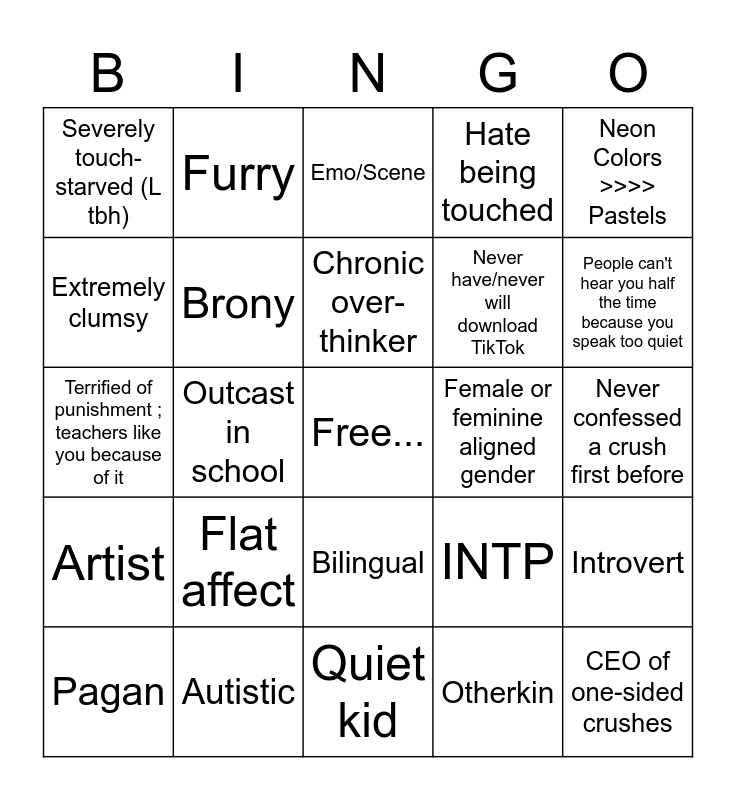 This bingo card has a free space and 24 words: Flat affect, Autistic, Chronic over-thinker, Pagan, Neon Colors >>>> Pastels, Severely touch-starved (L tbh), Extremely clumsy, Furry, Female or feminine aligned gender, Bilingual, Never have/never will download TikTok, Terrified of punishment ; teachers like you because of it, INTP, Introvert, Brony, Otherkin, Never confessed a crush first before, Emo/Scene, People can't hear you half the time because you speak too quiet, Outcast in school, CEO of one-sided crushes, Artist, Hate being touched and Quiet kid.