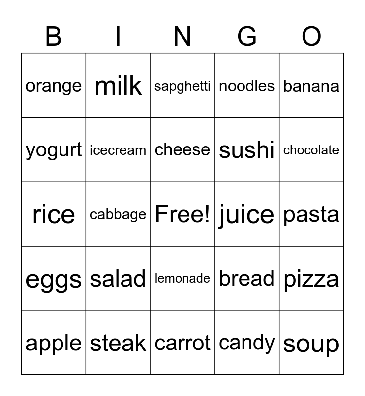 This bingo card has a free space and 24 words: salad, steak, cheese, apple, banana, orange, yogurt, milk, juice, lemonade, sushi, rice, bread, pizza, icecream, candy, pasta, sapghetti, chocolate, cabbage, soup, eggs, noodles and carrot.
