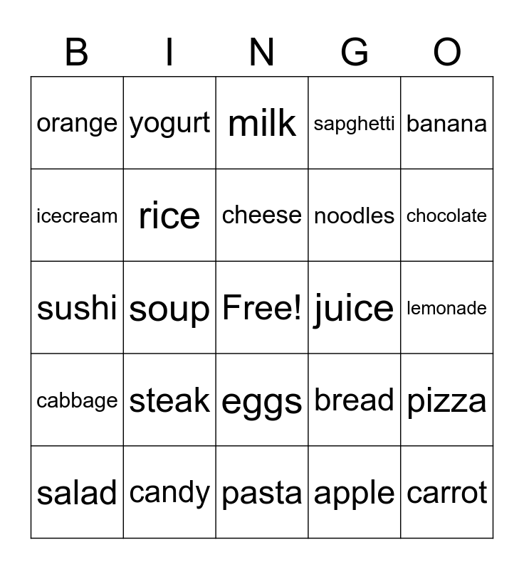 This bingo card has a free space and 24 words: salad, steak, cheese, apple, banana, orange, yogurt, milk, juice, lemonade, sushi, rice, bread, pizza, icecream, candy, pasta, sapghetti, chocolate, cabbage, soup, eggs, noodles and carrot.