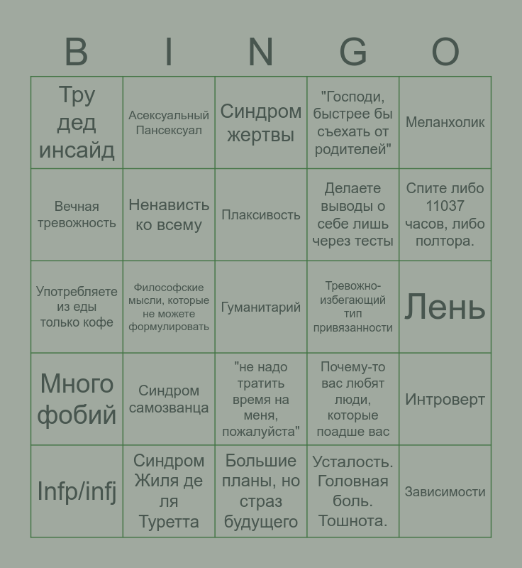 This bingo card has a free space and 24 words: Синдром самозванца, Синдром Жиля де ля Туретта, Плаксивость, Infp/infj, Меланхолик, Тру дед инсайд, Вечная тревожность, Асексуальный Пансексуал, Тревожно- избегающий тип привязанности, "не надо тратить время на меня, пожалуйста", Делаете выводы о себе лишь через тесты, Употребляете из еды только кофе, Почему-то вас любят люди, которые поадше вас, Интроверт, Ненависть ко всему, Усталость. Головная боль. Тошнота., Лень, Синдром жертвы, Спите либо 11037 часов, либо полтора., Философские мысли, которые не можете формулировать, Зависимости, Много фобий, "Господи, быстрее бы съехать от родителей" and Большие планы, но страз будущего.