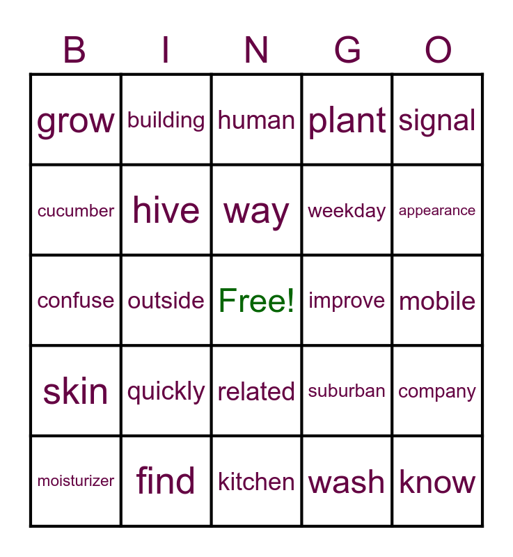 This bingo card has a free space and 78 words: once, disappear, human, in trouble, scientist, agree, since, entirely, near, future, important, pollinate, plant, grow, crop, cucumber, grapefruit, quickly, believe, mobile, problem, signal, confuse, way, hive, poison, suppose, government, stay, healthy, appearance, delicious, kitchen, energy, moisturizer, improve, honey, urban, area, know, city, example, large, population, space, building, public, transportation, museum, theater, company, outside, suburban, yard, own, park, garden, family, remember, related, weekday, entertain, enjoy, peaceful, quiet, weekend, wound, sweet, skin, find, teaspoon, heal, cough, stop, wash, soft, extra and find.