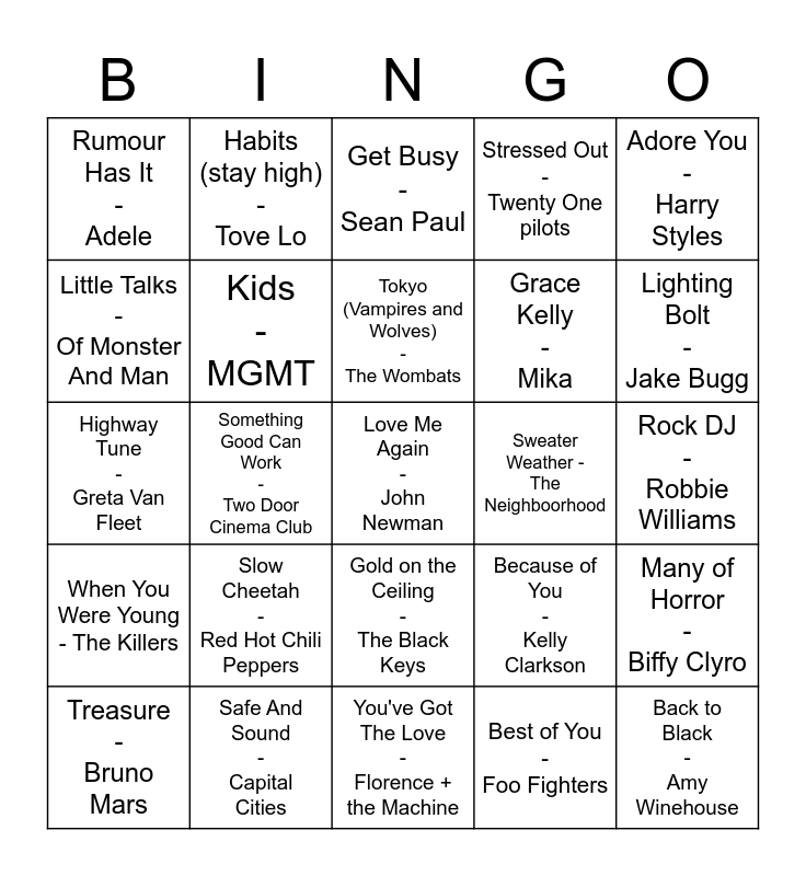 This bingo card has a free space and 54 words: Teenagers - My Chemical Romance, When You Were Young - The Killers, Last Nite - The Strokes, Obstacle 1 - Interpol, Gold on the Ceiling - The Black Keys, Still into You - Paramore, Stressed Out - Twenty One pilots, I sat by the Ocean - Queens of the Stone Age, Little Talks - Of Monster And Man, Pumped Up Kicks - Foster The People, Rumour Has It - Adele, Born To Die - Lana Del Rey, Safe And Sound - Capital Cities, Treasure - Bruno Mars, Just Give Me a Reason - P!nk ft. Nate Ruess, You've Got The Love - Florence + the Machine, Back to Black - Amy Winehouse, Grace Kelly - Mika, Teenage Dirtbag - Wheatus, Rock DJ - Robbie Williams, Because of You - Kelly Clarkson, The Less I know The Better - Tame Impala, Sweater Weather - The Neighboorhood, Adore You - Harry Styles, Wait a Minute! - Willow, Habits (stay high) - Tove Lo, Pocketful of Sunshine - Natasha Bedingfield, Daughters - John Mayer, Fallin' - Alicia Keys, Best of You - Foo Fighters, 505 - Arctic Monkeys, The Real Slim Shady - Eminem, Alors on Dance - Stromae, Clocks - Coldplay, Get Busy - Sean Paul, Sail - AWOLNATION, Highway Tune - Greta Van Fleet, Many of Horror - Biffy Clyro, A-Punk - Vampire Weekend, Kids - MGMT, Chelsea Dagger - The Fratellis, We Are Young - Fun, Naive - The Kooks, Feel Good Inc. - Gorillaz, Slow Cheetah - Red Hot Chili Peppers, She's So Lovely - Scouting For Girls, Chocolate - 1975, Islands In The Sun - Weezer, Tokyo (Vampires and Wolves) - The Wombats, Something Good Can Work - Two Door Cinema Club, Lighting Bolt - Jake Bugg, Pumpin Blood - NONONO, Suddenly I See - KT Tunstall and I Don't Feel Like Dancing - Scissor Sisters.
