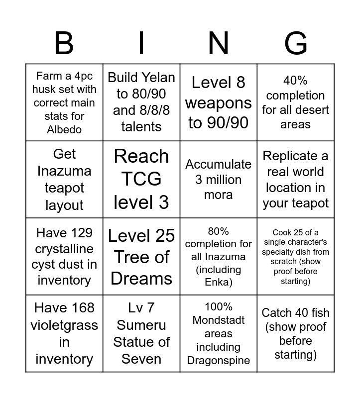 This bingo card has 16 words: Have 168 violetgrass in inventory, Lv 7 Sumeru Statue of Seven, Level 8 weapons to 90/90, 40% completion for all desert areas, Get Inazuma teapot layout, Build Yelan to 80/90 and 8/8/8 talents, 80% completion for all Inazuma (including Enka), Cook 25 of a single character's specialty dish from scratch (show proof before starting), Farm a 4pc husk set with correct main stats for Albedo, Reach TCG level 3, 100% Mondstadt areas including Dragonspine, Replicate a real world location in your teapot, Have 129 crystalline cyst dust in inventory, Level 25 Tree of Dreams, Accumulate 3 million mora and Catch 40 fish (show proof before starting).