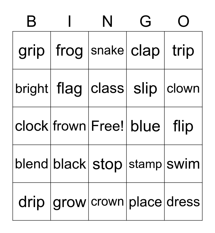 This bingo card has a free space and 24 words: black, grow, class, drip, trip, grip, bright, frog, blue, stop, slip, clock, stamp, swim, flag, place, flip, snake, clown, frown, dress, blend, clap and crown.