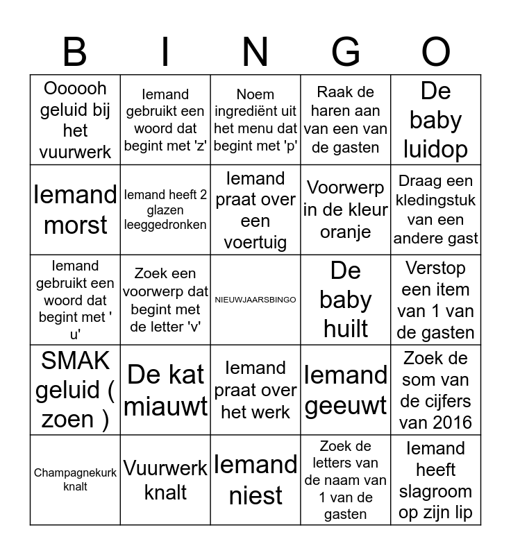 This bingo card has a free space and 24 words: De kat miauwt, Vuurwerk knalt, Iemand praat over een voertuig, Champagnekurk knalt, De baby luidop, Oooooh geluid bij het vuurwerk, Iemand morst, Iemand gebruikt een woord dat begint met 'z', De baby huilt, Iemand praat over het werk, Voorwerp in de kleur oranje, Iemand gebruikt een woord dat begint met ' u', Iemand geeuwt, Zoek de som van de cijfers van 2016, Iemand heeft 2 glazen leeggedronken, Zoek de letters van de naam van 1 van de gasten, Verstop een item van 1 van de gasten, Noem ingrediënt uit het menu dat begint met 'p', Draag een kledingstuk van een andere gast, Zoek een voorwerp dat begint met de letter 'v', Iemand heeft slagroom op zijn lip, SMAK geluid ( zoen ), Raak de haren aan van een van de gasten and Iemand niest.