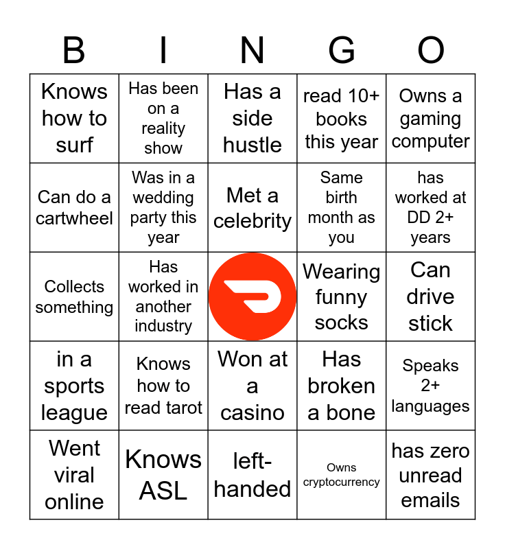This bingo card has a free space and 24 words: Knows how to read tarot, Knows ASL, Met a celebrity, Went viral online, Owns a gaming computer, Knows how to surf, Can do a cartwheel, Has been on a reality show, Wearing funny socks, Won at a casino, Same birth month as you, Collects something, Has broken a bone, Speaks 2+ languages, Was in a wedding party this year, Owns cryptocurrency, Can drive stick, Has a side hustle, has worked at DD 2+ years, Has worked in another industry, has zero unread emails, in a sports league, read 10+ books this year and left-handed.