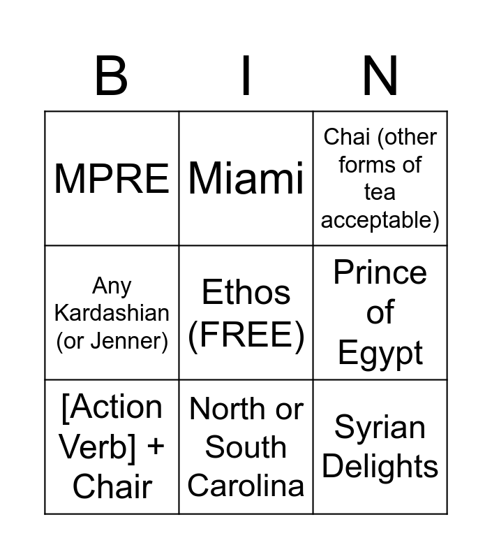 This bingo card has a free space and 8 words: Prince of Egypt, Chai (other forms of tea acceptable), Miami, [Action Verb] + Chair, MPRE, Syrian Delights, Any Kardashian (or Jenner) and North or South Carolina.