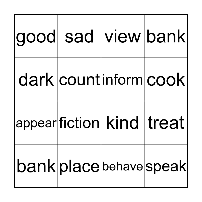 This bingo card has a free space and 15 words: bank, speak, view, good, cook, dark, fiction, behave, count, appear, treat, bank, inform, sad and place.