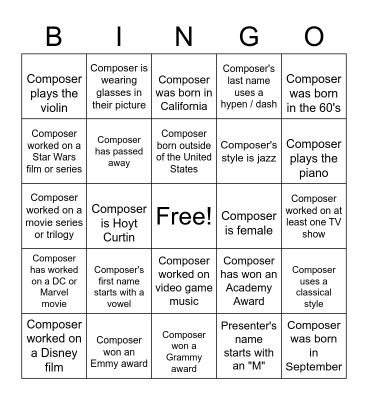 This bingo card has a free space and 24 words: Composer's first name starts with a vowel, Composer won an Emmy award, Composer born outside of the United States, Composer worked on a Disney film, Composer was born in the 60's, Composer plays the violin, Composer worked on a Star Wars film or series, Composer is wearing glasses in their picture, Composer is female, Composer worked on video game music, Composer's style is jazz, Composer worked on a movie series or trilogy, Composer has won an Academy Award, Composer uses a classical style, Composer has passed away, Presenter's name starts with an "M", Composer worked on at least one TV show, Composer was born in California, Composer plays the piano, Composer is Hoyt Curtin, Composer was born in September, Composer has worked on a DC or Marvel movie, Composer's last name uses a hypen / dash and Composer won a Grammy award.