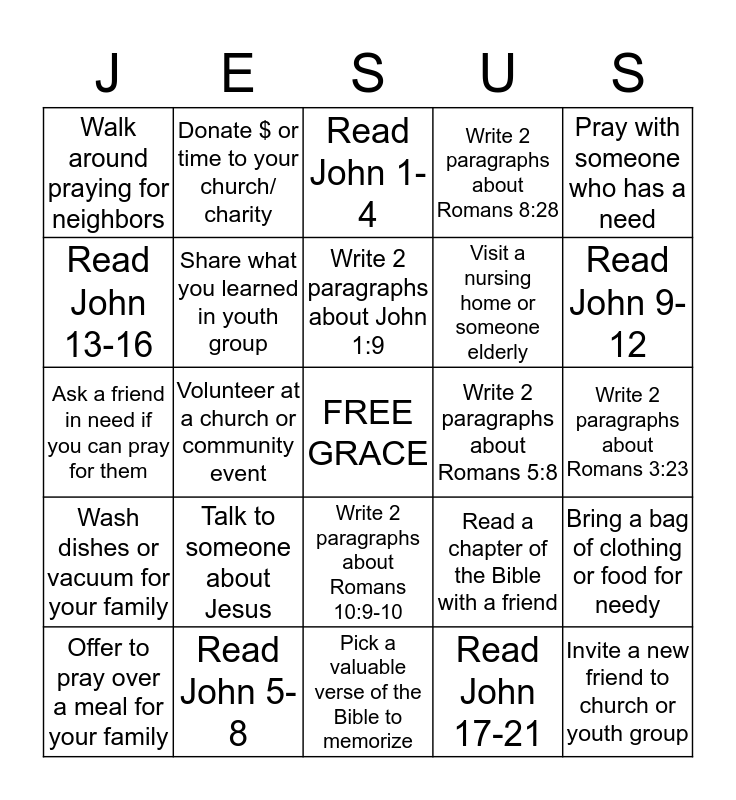 This bingo card has a free space and 24 words: Talk to someone about Jesus, Read John 5-8, Write 2 paragraphs about John 1:9, Offer to pray over a meal for your family, Pray with someone who has a need, Walk around praying for neighbors, Read John 13-16, Donate $ or time to your church/ charity, Write 2 paragraphs about Romans 5:8, Write 2 paragraphs about Romans 10:9-10, Visit a nursing home or someone elderly, Ask a friend in need if you can pray for them, Read a chapter of the Bible with a friend, Bring a bag of clothing or food for needy, Share what you learned in youth group, Read John 17-21, Write 2 paragraphs about Romans 3:23, Read John 1-4, Read John 9-12, Volunteer at a church or community event, Invite a new friend to church or youth group, Wash dishes or vacuum for your family, Write 2 paragraphs about Romans 8:28 and Pick a valuable verse of the Bible to memorize.