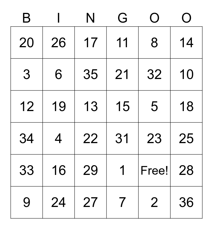 This bingo card has 37 words: Free!, 1, 2, 3, 4, 5, 6, 7, 8, 9, 10, 11, 12, 13, 14, 15, 16, 17, 18, 19, 20, 21, 22, 23, 24, 25, 26, 27, 28, 29, 30, 31, 32, 33, 34, 35 and 36.
