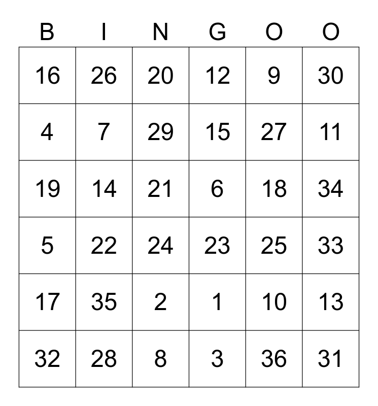This bingo card has 36 words: 1, 2, 3, 4, 5, 6, 7, 8, 9, 10, 11, 12, 13, 14, 15, 16, 17, 18, 19, 20, 21, 22, 23, 24, 25, 26, 27, 28, 29, 30, 31, 32, 33, 34, 35 and 36.