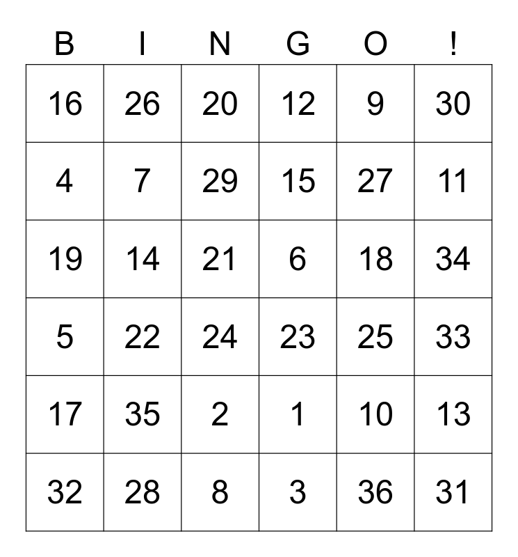 This bingo card has 36 words: 1, 2, 3, 4, 5, 6, 7, 8, 9, 10, 11, 12, 13, 14, 15, 16, 17, 18, 19, 20, 21, 22, 23, 24, 25, 26, 27, 28, 29, 30, 31, 32, 33, 34, 35 and 36.
