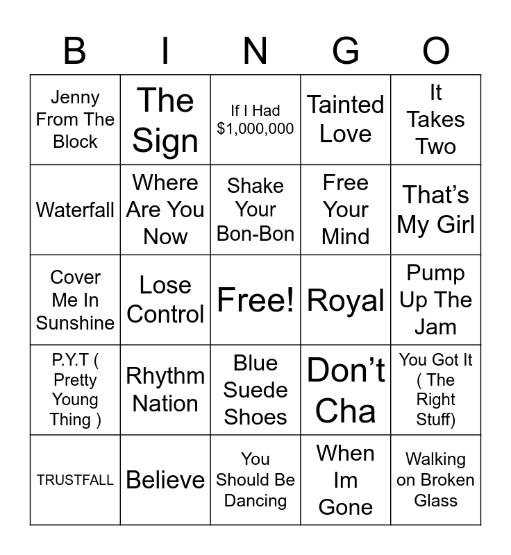 This bingo card has a free space and 63 words: My Lovin’, We’ve Got It Goin’ On, Step By Step, You Got It ( The Right Stuff), Tonight, In The Summertime, The Sign, Tearin’ Up My Heart, Shake Your Bon-Bon, Motownphilly, Blue Suede Shoes, Rhythm Is Gonna Get You, Pump Up The Jam, It Takes Two, American Woman, Waterfall, Lose Control, Jenny From The Block, My Prerogative, Free Your Mind, Rhythm Nation, P.Y.T ( Pretty Young Thing ), Tainted Love, Look What You Made Me Do, Sit Still , Look Pretty, Say My Name, Dirty Little Secret, Titanium, Before He Cheats, Only Human, Yummy, bad guy, Sunday Best, Light Switch, That’s My Girl, TRUSTFALL, When, When Im Gone, Watermelon Sugar, Where Are You Now, Cover Me In Sunshine, Royal, How Will I Know, Queen Of The Night, Walking on Broken Glass, Believe, Whatta Man, Don’t Cha, Two Princes, Brass Monkey, Handclap, You Should Be Dancing, Baby, I love Your Way, All The Small Things, Hey, Soul Sister, If I Had $1,000,000, Hard To Handle, Boombastic, Gimme Shelter, Come Together, The Joker, ( I Can’t Get No ) Satisfaction and Victoria Secret.