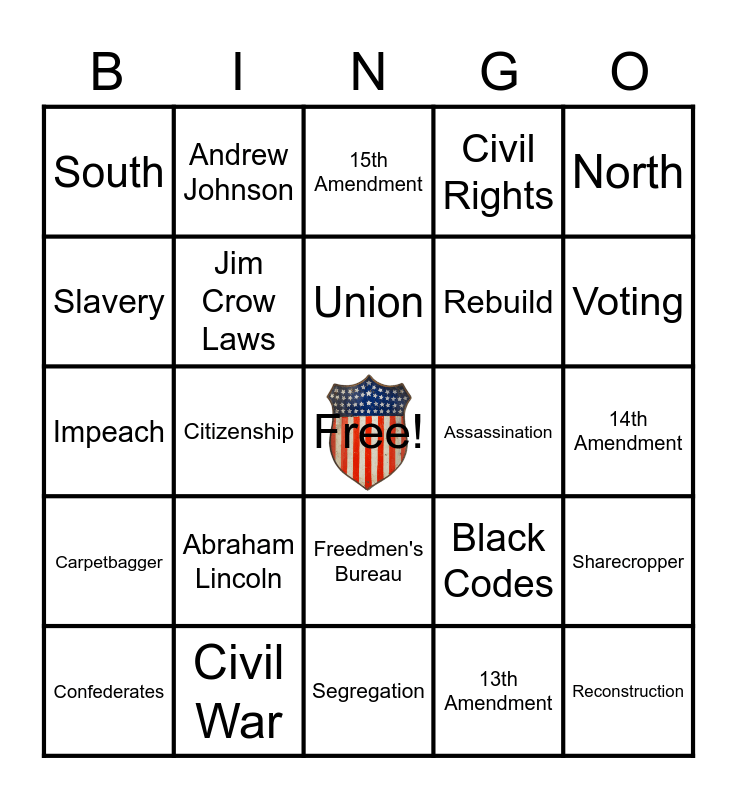 This bingo card has a free space and 24 words: Abraham Lincoln, Civil War, Union, Confederates, North, South, Slavery, Andrew Johnson, Assassination, Freedmen's Bureau, Rebuild, Impeach, Black Codes, Sharecropper, Jim Crow Laws, 13th Amendment, 14th Amendment, 15th Amendment, Voting, Citizenship, Reconstruction, Carpetbagger, Civil Rights and Segregation.
