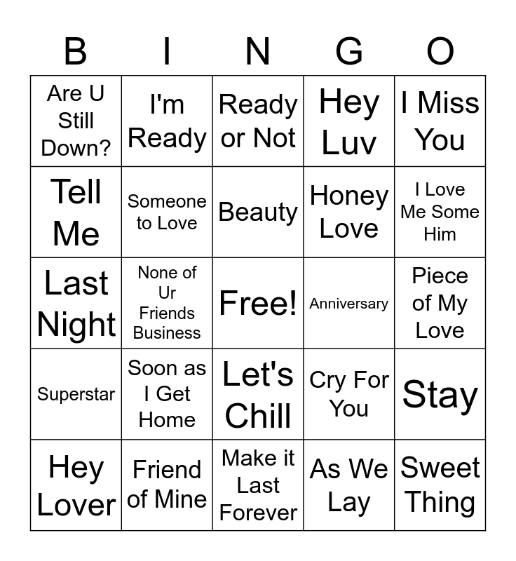 This bingo card has a free space and 26 words: Let's Chill, As We Lay, Beauty, Friend of Mine, I Miss You, Are U Still Down?, Tell Me, I'm Ready, Piece of My Love, Cry For You, Honey Love, Last Night, Stay, Hey Lover, None of Ur Friends Business, Slow Dance, Hey Luv, Superstar, Ready or Not, Sweet Thing, I Love Me Some Him, Make it Last Forever, Anniversary, Soon as I Get Home, Someone to Love and Just Kickin.
