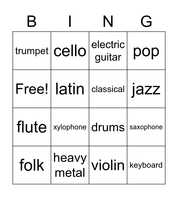 This bingo card has 16 words: heavy metal, saxophone, electric guitar, trumpet, flute, cello, drums, violin, Free!, latin, folk, pop, xylophone, jazz, classical and keyboard.