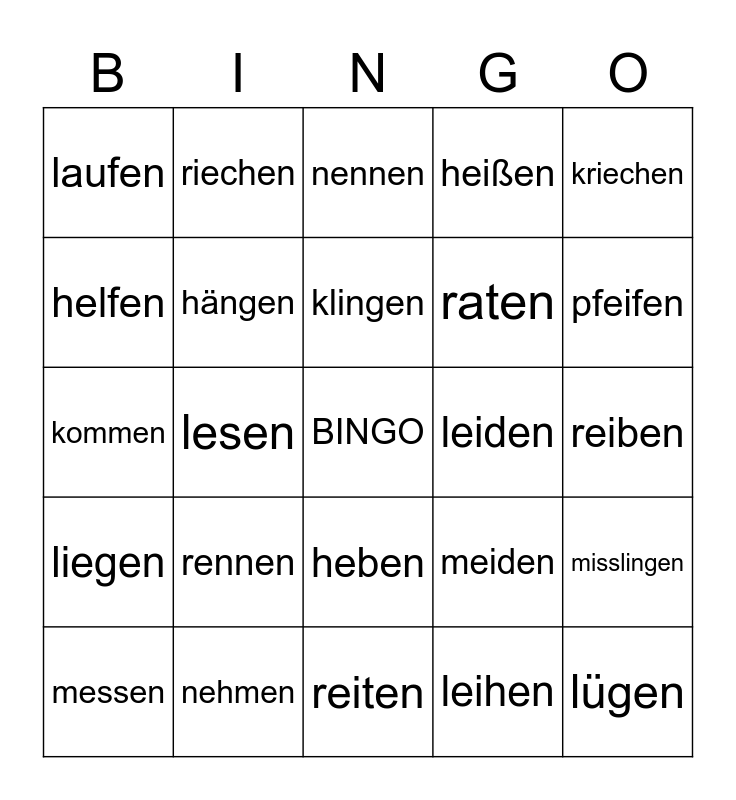 This bingo card has a free space and 35 words: haben, halten, hängen, hängen, heben, heißen, helfen, kennen, klingen, kneifen, kommen, kriechen, laden, lassen, laufen, leiden, leihen, lesen, liegen, lügen, meiden, messen, misslingen, nehmen, nennen, pfeifen, preisen, quellen, raten, reiben, reißen, reiten, rennen, riechen and ringen.