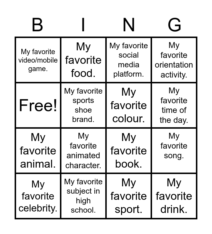 This bingo card has 16 words: My favorite subject in high school., My favorite song., My favorite social media platform., My favorite video/mobile game., My favorite animal., My favorite food., My favorite book., My favorite sport., Free!, My favorite sports shoe brand., My favorite celebrity., My favorite orientation activity., My favorite animated character., My favorite time of the day., My favorite colour. and My favorite drink..