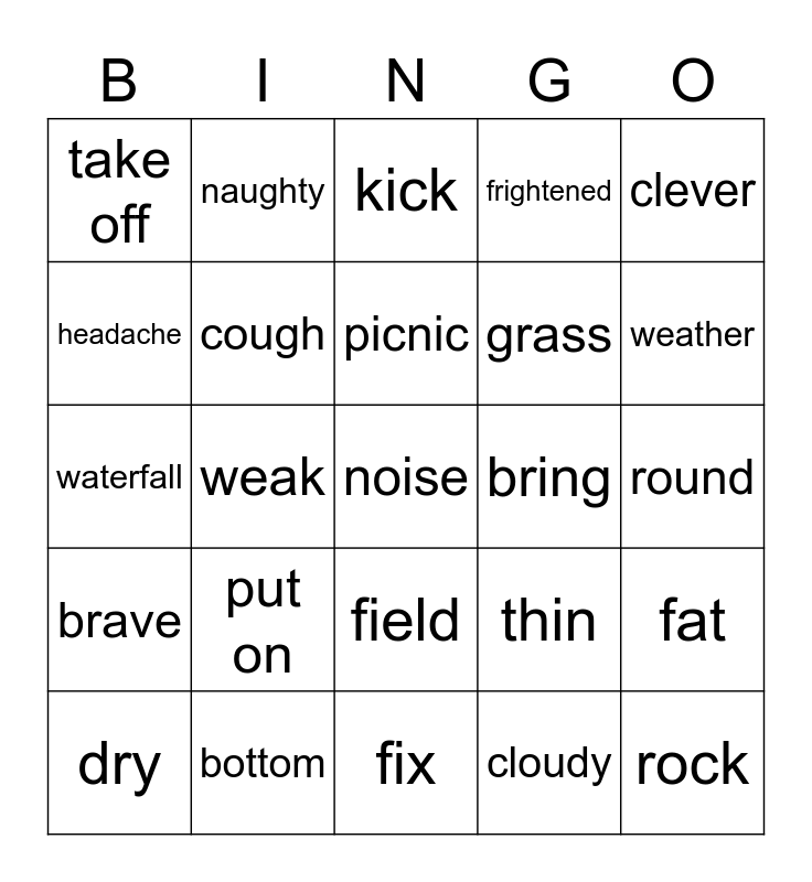 This bingo card has a free space and 24 words: put on, bottom, picnic, dry, clever, take off, headache, naughty, bring, field, grass, waterfall, thin, fat, cough, cloudy, round, kick, weather, weak, rock, brave, frightened and fix.