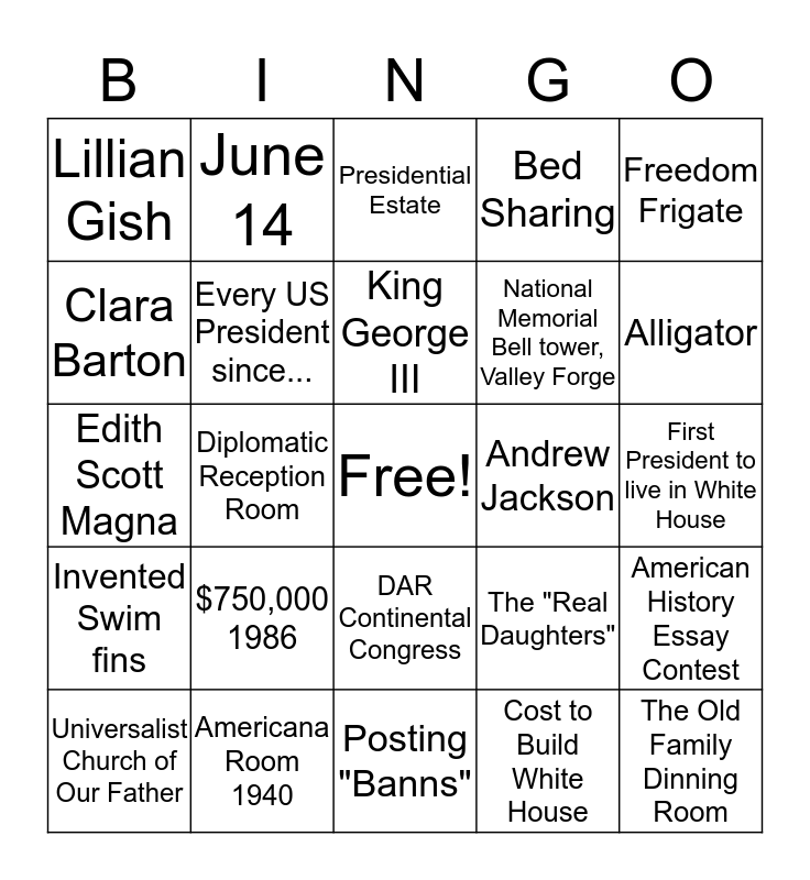 This bingo card has a free space and 24 words: $750,000 1986, Americana Room 1940, King George III, Universalist Church of Our Father, Freedom Frigate, Lillian Gish, Clara Barton, June 14, Andrew Jackson, DAR Continental Congress, National Memorial Bell tower, Valley Forge, Edith Scott Magna, The "Real Daughters", American History Essay Contest, Every US President since..., Cost to Build White House, First President to live in White House, Presidential Estate, Alligator, Diplomatic Reception Room, The Old Family Dinning Room, Invented Swim fins, Bed Sharing and Posting "Banns".