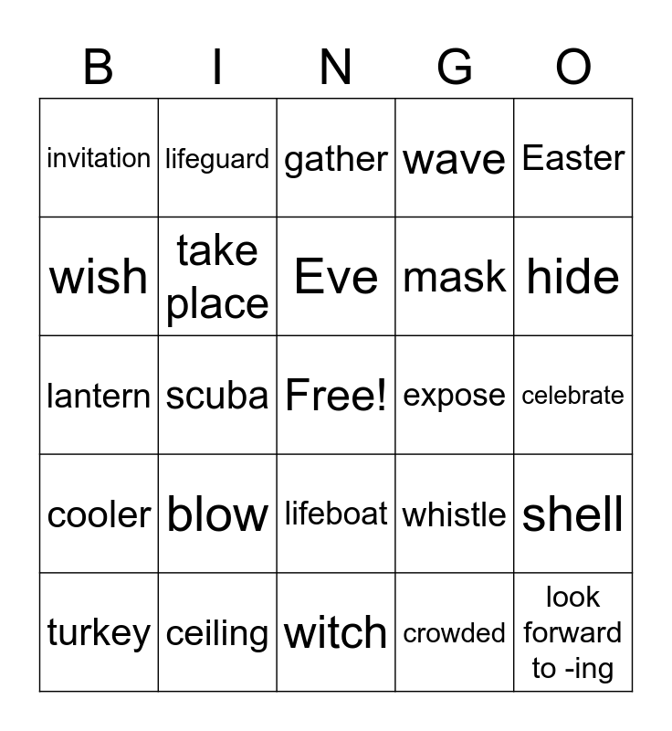 This bingo card has a free space and 24 words: blow, ceiling, Eve, turkey, Easter, invitation, wish, lifeguard, expose, lifeboat, mask, lantern, whistle, shell, take place, crowded, celebrate, gather, hide, scuba, look forward to -ing, cooler, wave and witch.