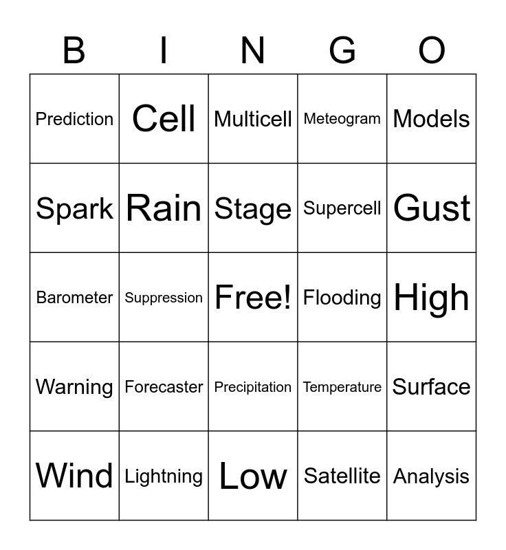 This bingo card has a free space and 34 words: Radar, Satellite, Weather, Forecast, Warning, Rain, Models, Wind, Cell, Thunder, Stage, Multicell, Cloud, Dry line, Flooding, Gust, Lightning, Barometer, Forecaster, Temperature, Precipitation, Data, Prediction, High, Low, Analysis, Meteogram, Burst, Supercell, Spark, Detection, Suppression, Surface and Cap.