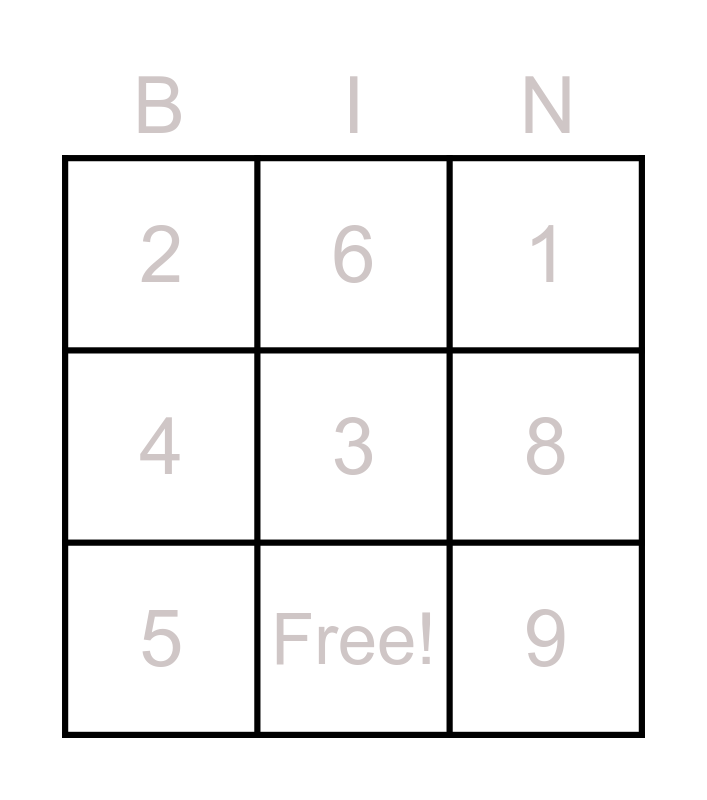 This bingo card has 10 words: Free!, 1, 2, 3, 4, 5, 6, 7, 8 and 9.