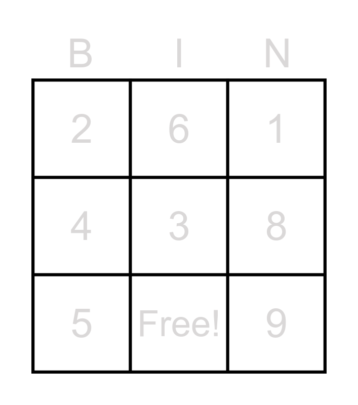 This bingo card has 10 words: Free!, 1, 2, 3, 4, 5, 6, 7, 8 and 9.