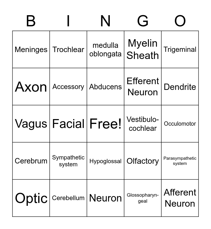 This bingo card has a free space and 24 words: Sympathetic system, Cerebellum, Abducens, Optic, Trigeminal, Meninges, Axon, Trochlear, Vestibulo- cochlear, Hypoglossal, Efferent Neuron, Vagus, Olfactory, Parasympathetic system, Accessory, Glossopharyn-geal, Occulomotor, medulla oblongata, Dendrite, Facial, Afferent Neuron, Cerebrum, Myelin Sheath and Neuron.