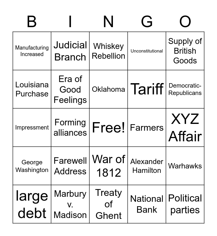 This bingo card has a free space and 29 words: large debt, Taxes, Forming alliances, Hamilton Jefferson, Manufacturing Increased, Whiskey Rebellion, Era of Good Feelings, Farewell Address, Farmers, Marbury v. Madison, XYZ Affair, Political parties, Treaty of Ghent, National Bank, Democratic- Republicans, Nationalism, War of 1812, George Washington, Supply of British Goods, Impressment, Alexander Hamilton, Monroe Doctrine, Tariff, Louisiana Purchase, Unconstitutional, Judicial Branch, Warhawks, Oklahoma and Trail of Tears.