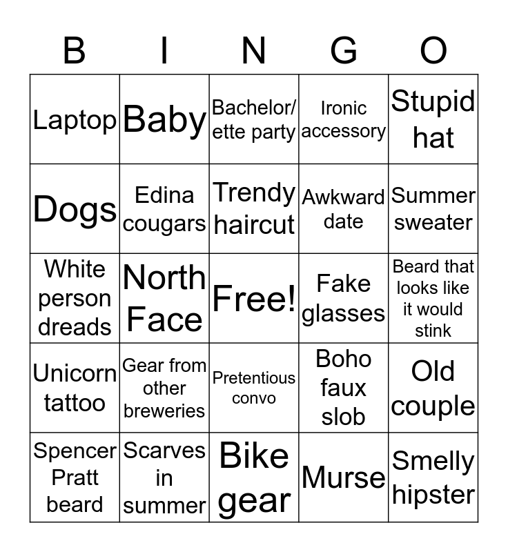 This bingo card has a free space and 24 words: Gear from other breweries, Scarves in summer, Trendy haircut, Spencer Pratt beard, Stupid hat, Laptop, Dogs, Baby, Fake glasses, Pretentious convo, Awkward date, White person dreads, Boho faux slob, Old couple, Edina cougars, Murse, Beard that looks like it would stink, Bachelor/ ette party, Summer sweater, North Face, Smelly hipster, Unicorn tattoo, Ironic accessory and Bike gear.