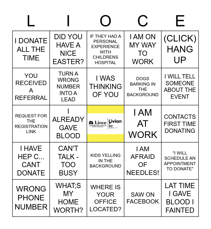 This bingo card has a free space and 24 words: CAN'T TALK - TOO BUSY, WHAT;S MY HOME WORTH?, I WAS THINKING OF YOU, WRONG PHONE NUMBER, (CLICK) HANG UP, I DONATE ALL THE TIME, YOU RECEIVED A REFERRAL, DID YOU HAVE A NICE EASTER?, I AM AT WORK, KIDS YELLING IN THE BACKGROUND, DOGS BARKING IN THE BACKGROUND, REQUEST FOR THE REGISTRATION LINK, I AM AFRAID OF NEEDLES!, "I WILL SCHEDULE AN APPOINTMENT TO DONATE", TURN A WRONG NUMBER INTO A LEAD, SAW ON FACEBOOK, CONTACTS FIRST TIME DONATING, IF THEY HAD A PERSONAL EXPERIENCE WITH CHILDRENS HOSPITAL, I WILL TELL SOMEONE ABOUT THE EVENT, I ALREADY GAVE BLOOD, LAT TIME I GAVE BLOOD I FAINTED, I HAVE HEP C... CANT DONATE, I AM ON MY WAY TO WORK and WHERE IS YOUR OFFICE LOCATED?.