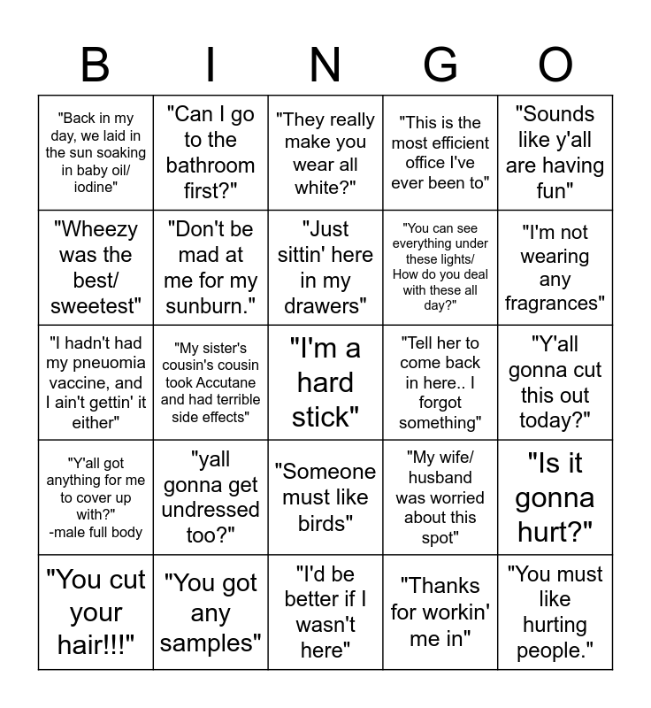 This bingo card has 25 words: "yall gonna get undressed too?", "I'd be better if I wasn't here", "Just sittin' here in my drawers", "You cut your hair!!!", "Sounds like y'all are having fun", "Back in my day, we laid in the sun soaking in baby oil/ iodine", "Wheezy was the best/ sweetest", "Can I go to the bathroom first?", "Tell her to come back in here.. I forgot something", "Someone must like birds", "You can see everything under these lights/ How do you deal with these all day?", "I hadn't had my pneuomia vaccine, and I ain't gettin' it either", "My wife/ husband was worried about this spot", "Is it gonna hurt?", "Don't be mad at me for my sunburn.", "You must like hurting people.", "Y'all gonna cut this out today?", "They really make you wear all white?", "I'm not wearing any fragrances", "My sister's cousin's cousin took Accutane and had terrible side effects", "I'm a hard stick", "You got any samples", "Y'all got anything for me to cover up with?" -male full body, "This is the most efficient office I've ever been to" and "Thanks for workin' me in".