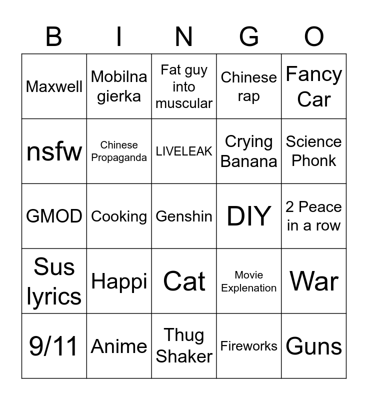 This bingo card has 25 words: Happi, Thug Shaker, LIVELEAK, 9/11, Fancy Car, Maxwell, nsfw, Mobilna gierka, DIY, Cat, Crying Banana, GMOD, Movie Explenation, War, Chinese Propaganda, Guns, 2 Peace in a row, Fat guy into muscular, Science Phonk, Cooking, Genshin, Anime, Sus lyrics, Chinese rap and Fireworks.